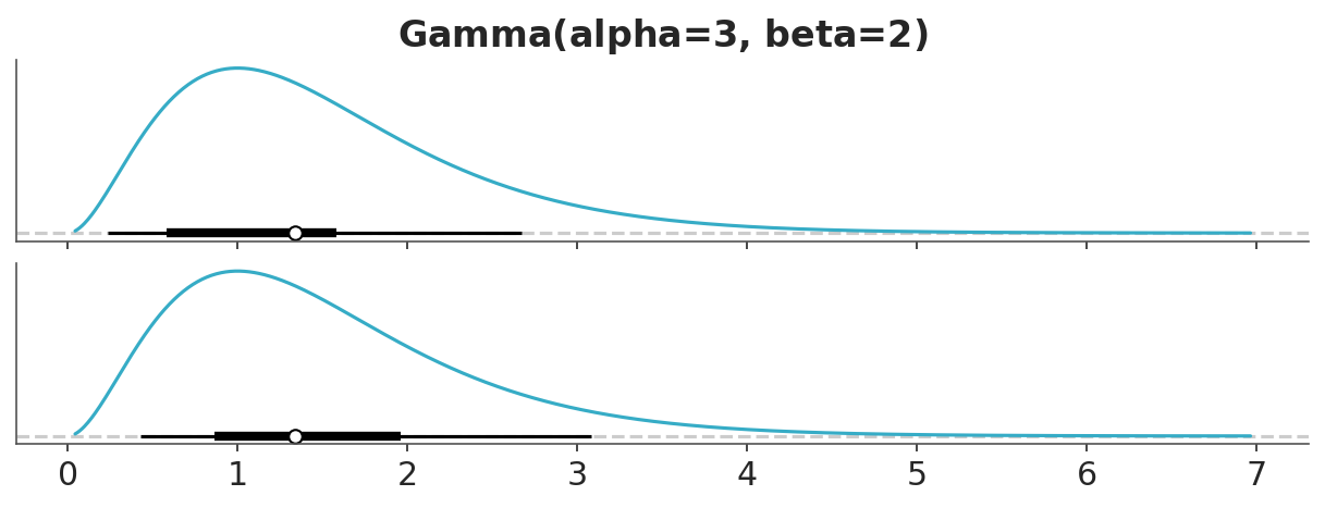 One issue with using a single number to summarize uncertainty is that it does not provide information about the shape of the distribution. For example, two distributions can have the same standard deviation but very different shapes. Or for bounded distributions like the Gamma, the standard deviation can be misleading, as it does not take into account that negative values are not allowed.