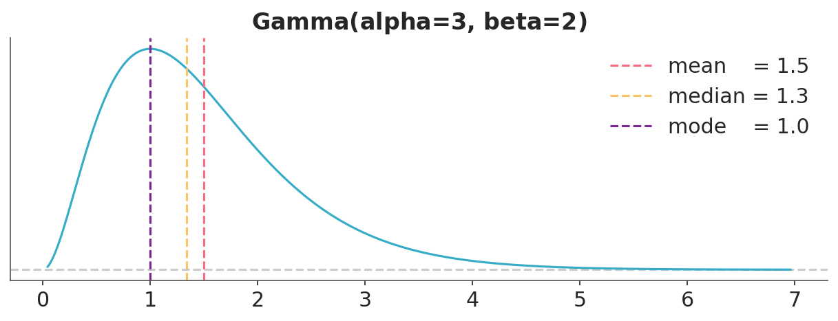 To summarize a distribution we usually use some measure of central tendency and some measure of dispersion. Common measures of central tendency include the mean, median, and mode. Figure 3.10 shows these three measures for a Gamma distribution.