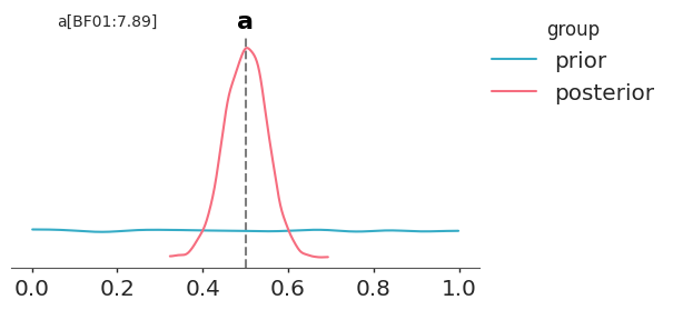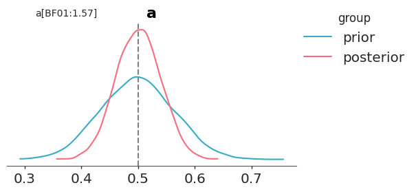 In the previous Figure we can see one KDE for the prior (black) and one for the posterior (gray). The two black dots show that we evaluated both distributions at the value 0.5. We can see that the Bayes factor in favor of the null hypothesis, BF_01, is \(\approx 8\), which we can interpret as moderate evidence in favor of the null hypothesis.