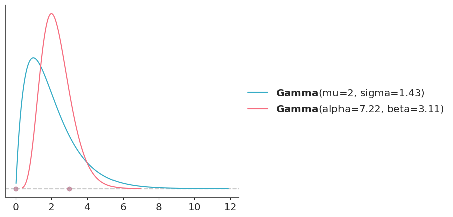 This procedure partially ignores the prior information in the model. For example, we would have obtained the same result with the prior α = pm.Normal("α", 0, 0.001) or α = pm.Normal("α", 0, 100). The reason is for this behaviour is that the function we use for the optimization procedure is just the likelihood. In step 5 (the last step) we use the information about each prior families i.e. α = pm.Normal("α", 20, 1) will not produce the same result as α = pm.Gamma("α", mu=20, sigma=1). Because the MLE is done for a given family. In principle, we could even ignore this information and fit the optimized values to many families and pick the best fit. This allows the procedure to suggest alternative families. For instance, it could be that we use a Normal for a given parameters but the optimization only found positive values so a Gamma or HalfNormal could be a better choice.